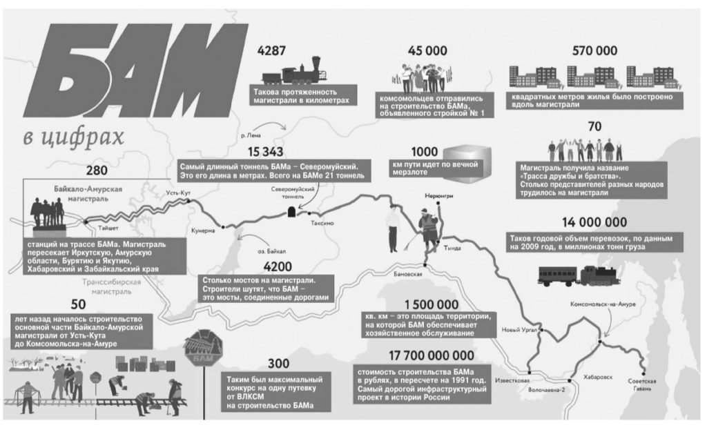 1989 — В 1989 году магистраль была передана Министерству путей сообщения и заработала регулярно. БАМ проходит по территории Амурской и Иркутской областей, Забайкальского и Хабаровского краев, Бурятии и Якутии.